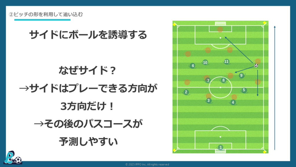 - ピッチの形を使ってサイドに誘導する
